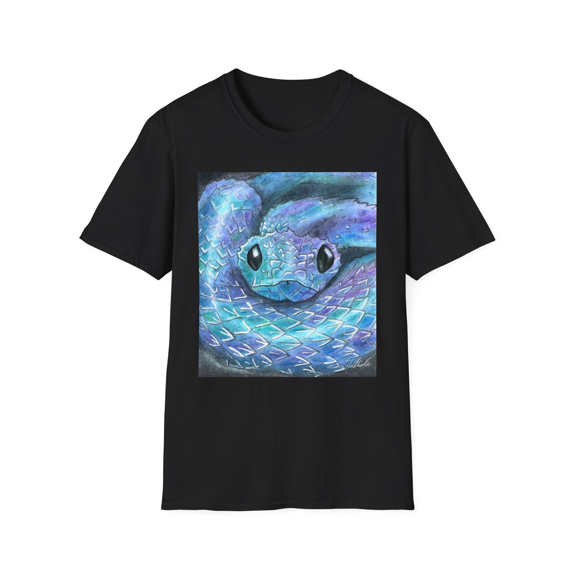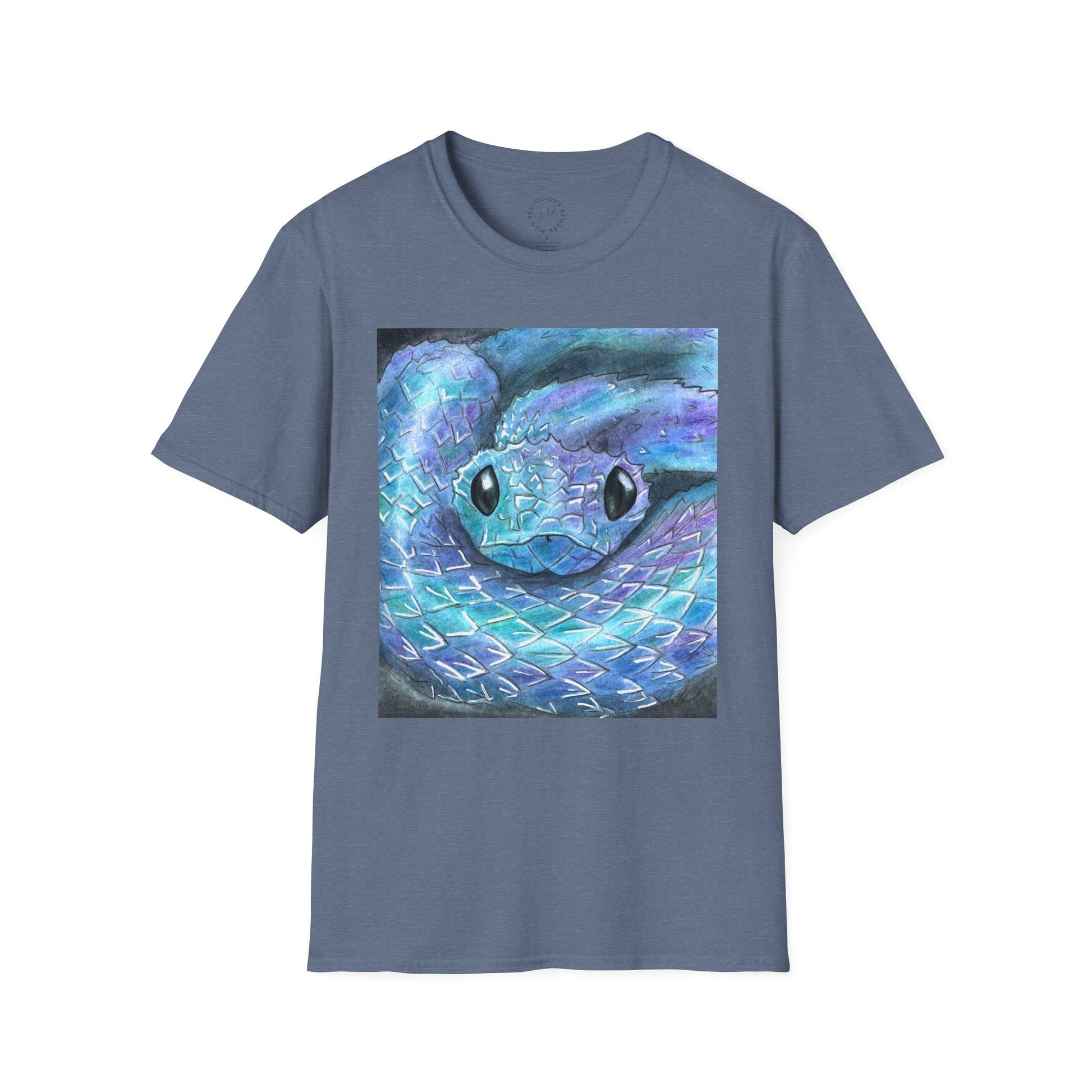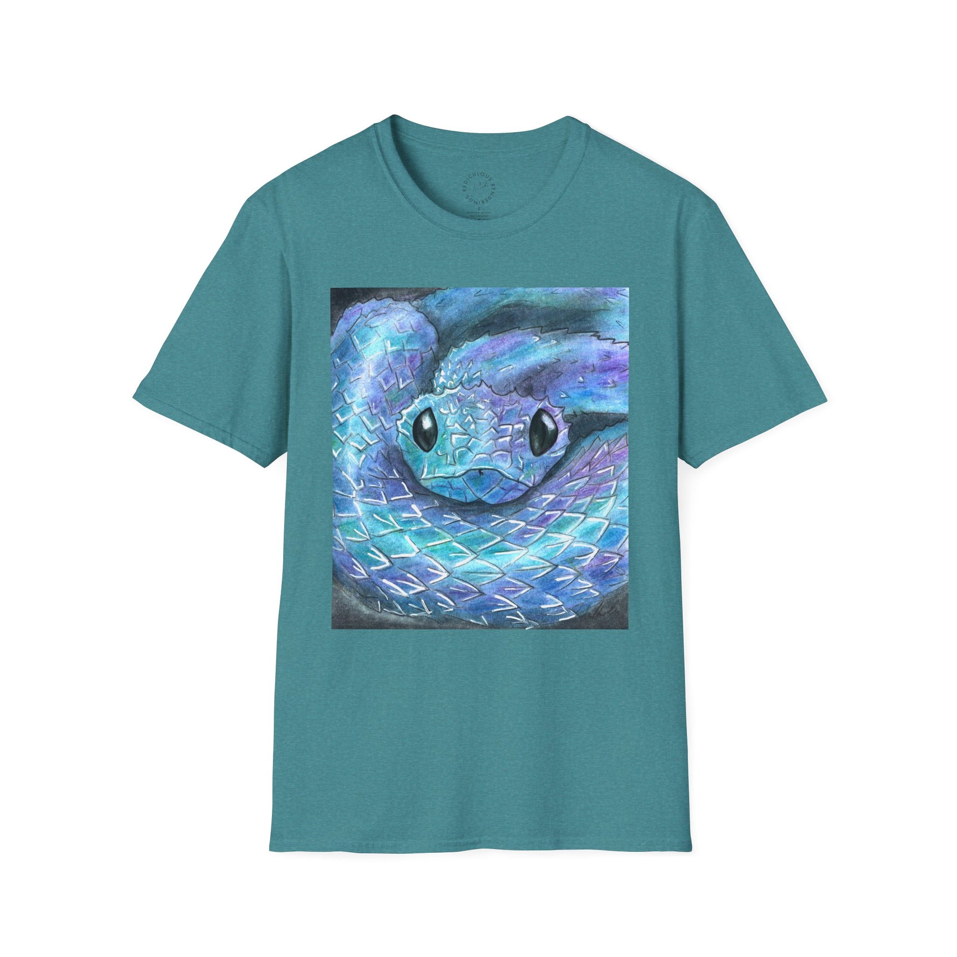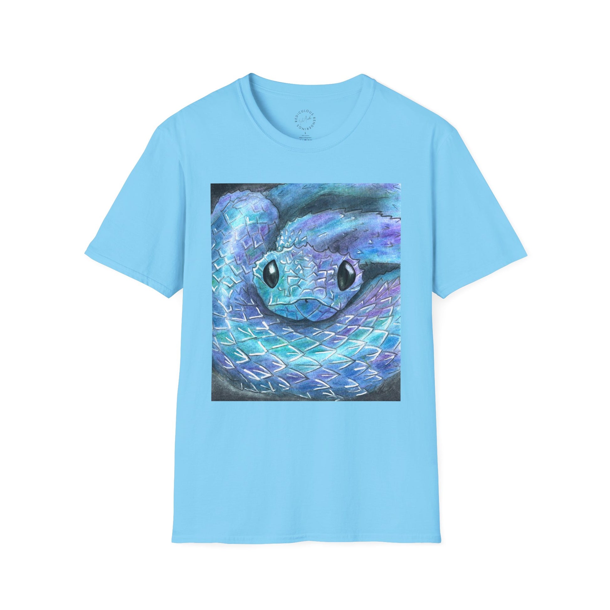 Vibrant hand drawn blue red and black snake soft unisex t-shirt that provides a comfortable and stylish look. Perfect for adults looking for a unique and eye-catching piece of clothing. Suitable for casual wear or as a statement piece for special occasions and events.