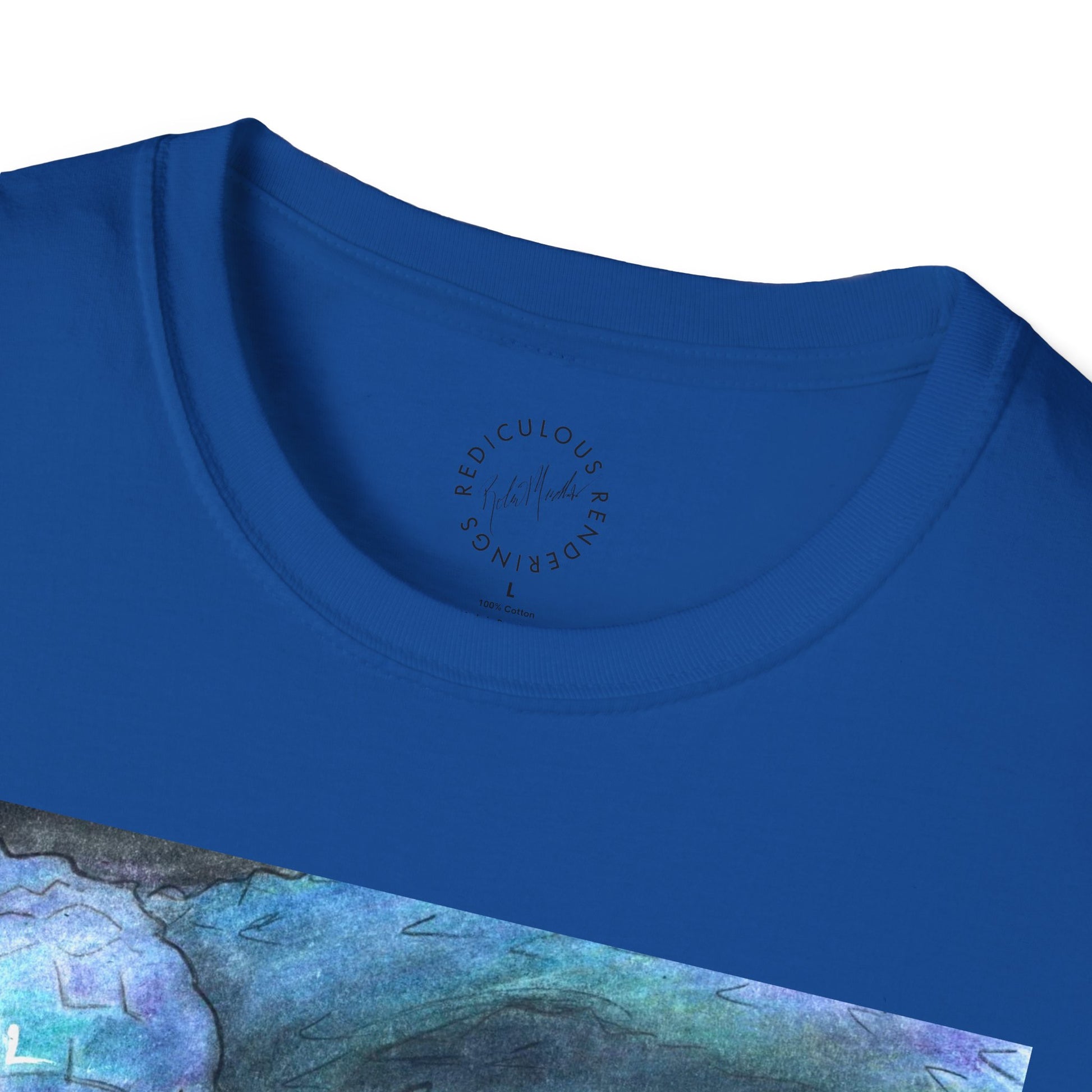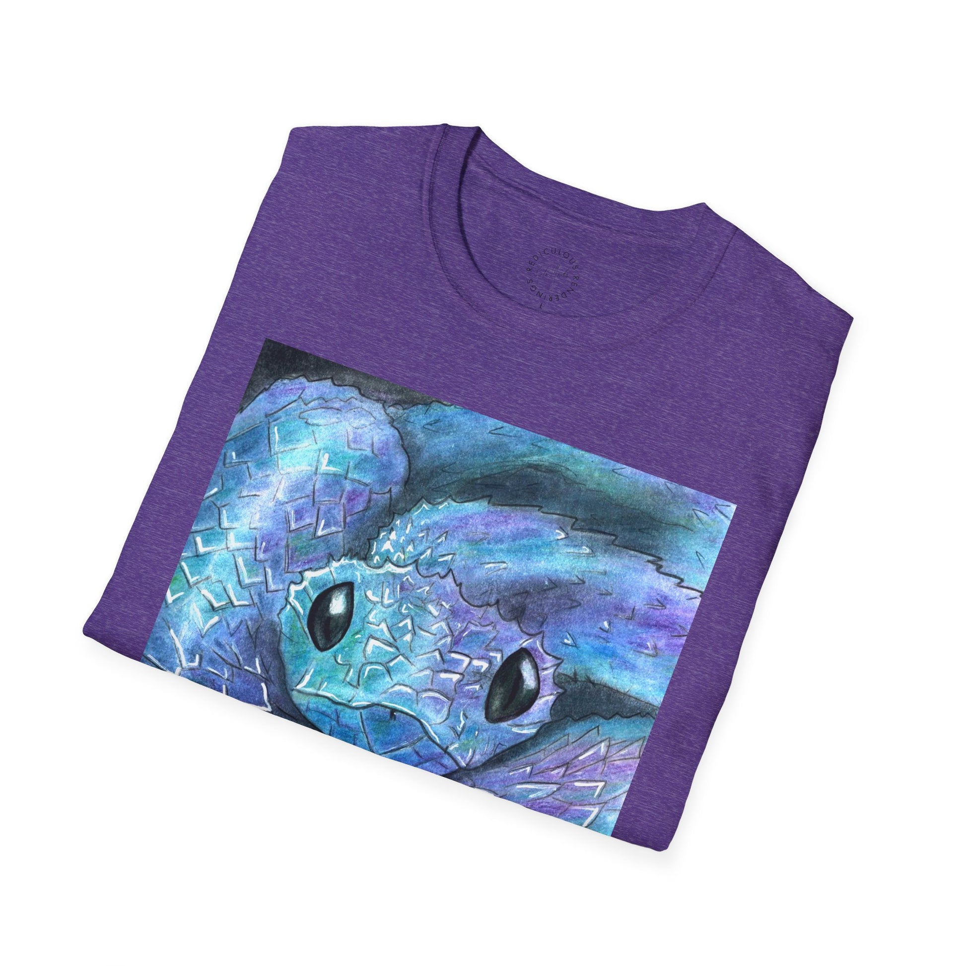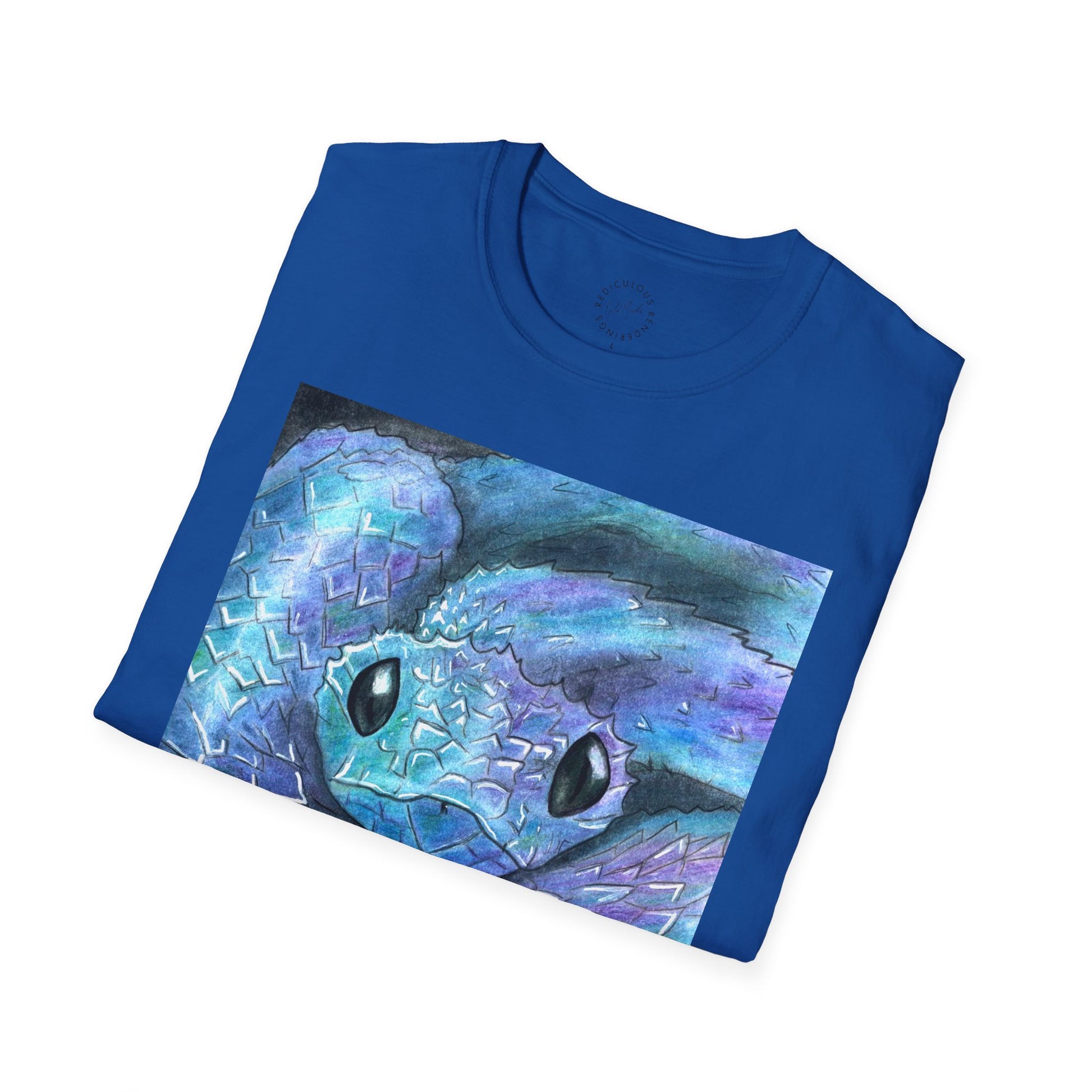 Vibrant hand drawn blue red and black snake soft unisex t-shirt that provides a comfortable and stylish look. Perfect for adults looking for a unique and eye-catching piece of clothing. Suitable for casual wear or as a statement piece for special occasions and events.