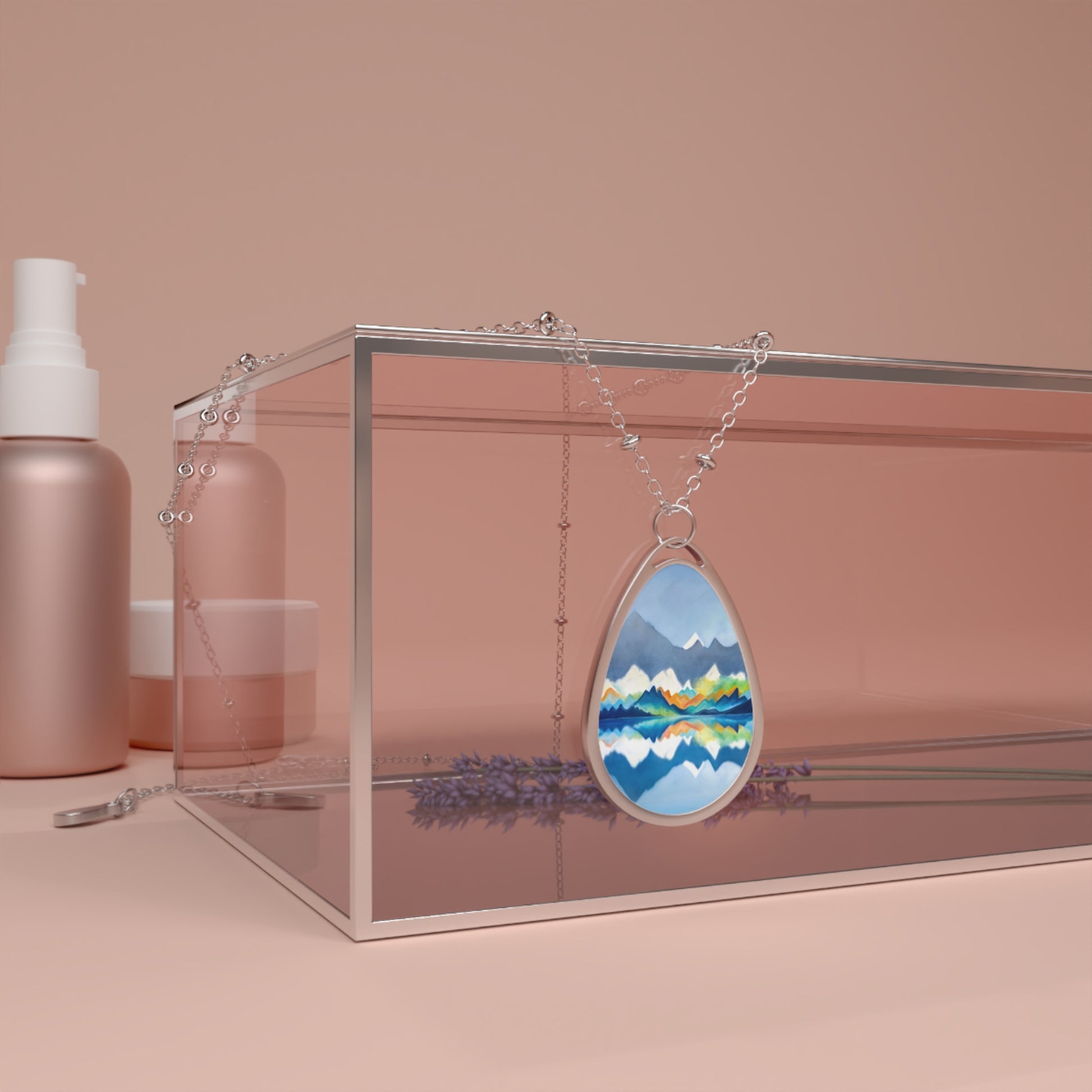 Silver Oval Pendant Necklace with Hand-painted Blue Mountain Range Art