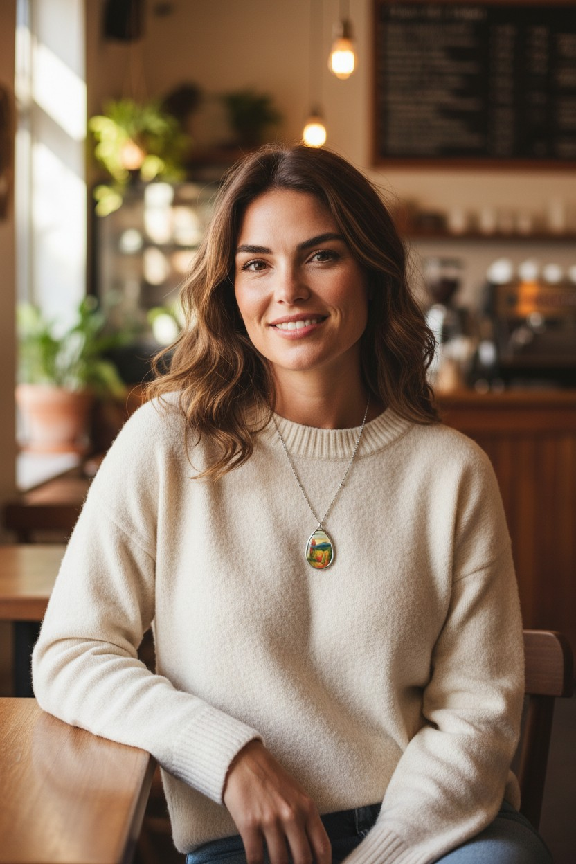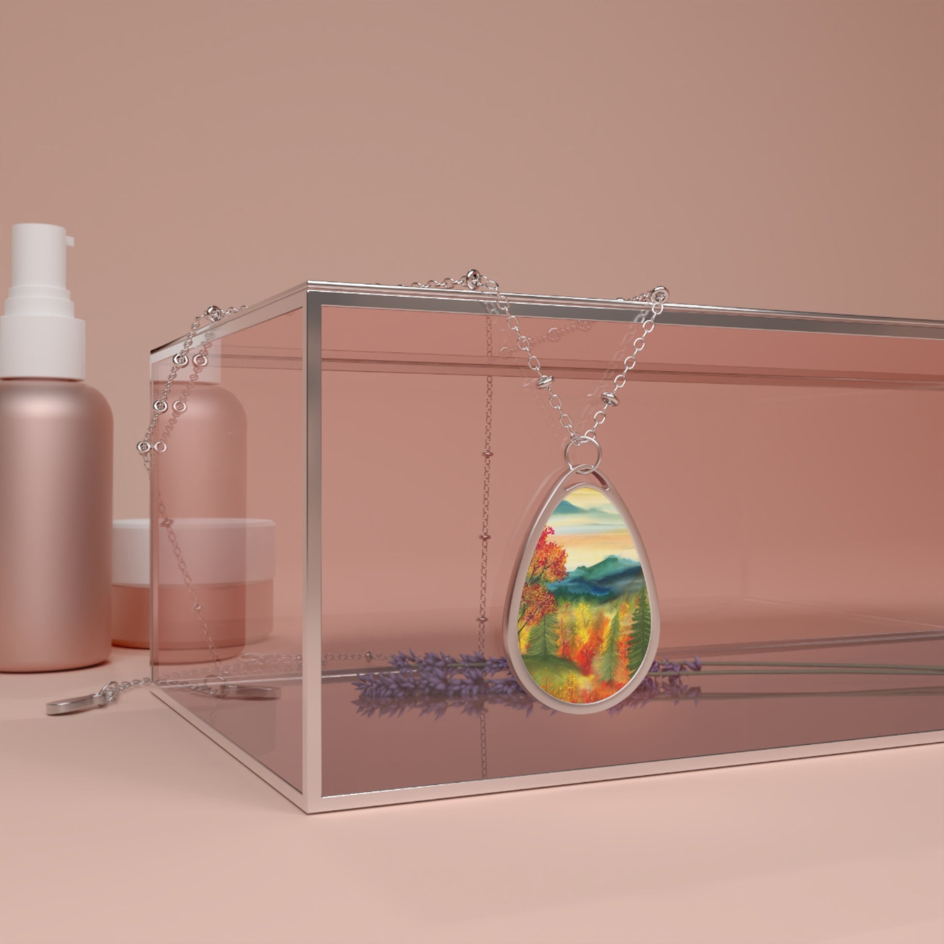 Silver Oval Pendant Necklace with Hand-painted Boho Fall Forest Nature Art