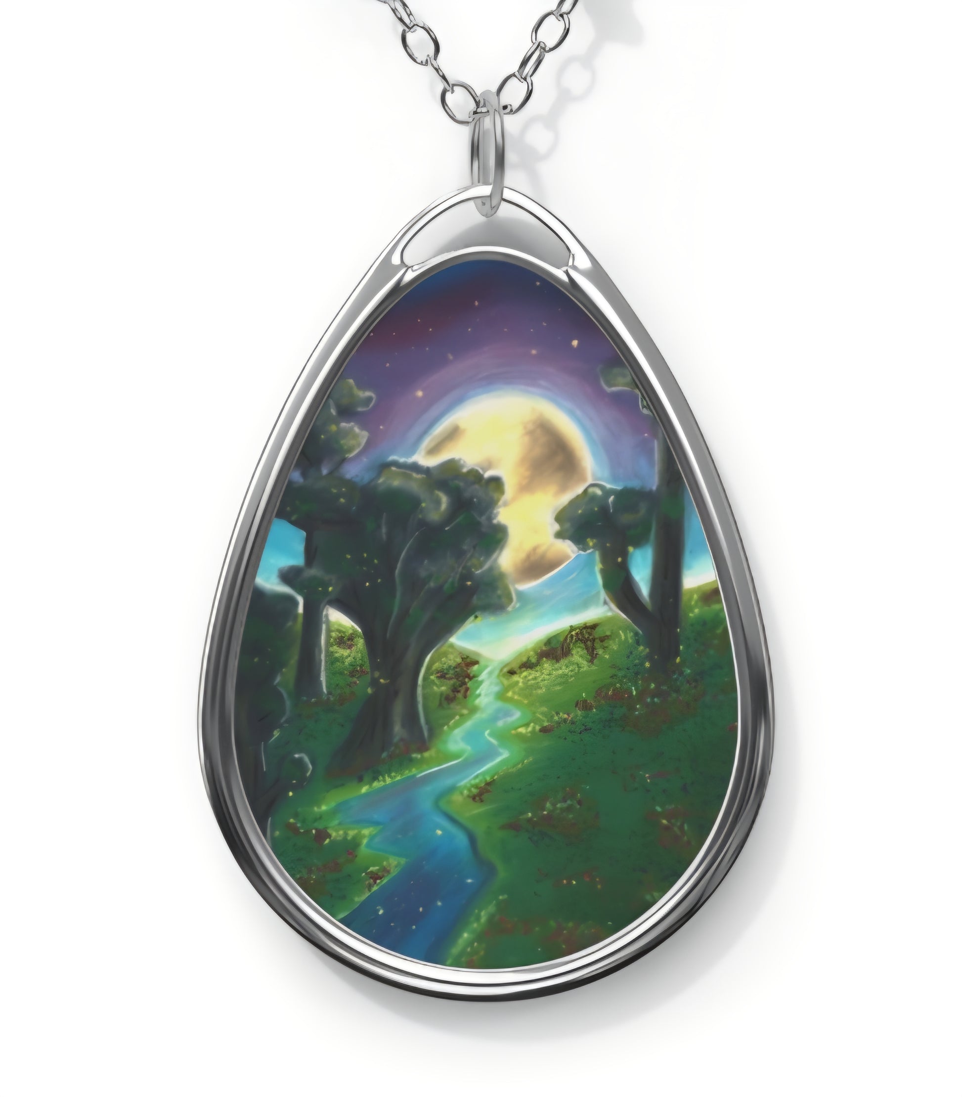 Silver Oval Pendant Necklace with Hand-painted Boho Forest Moon Nature Art