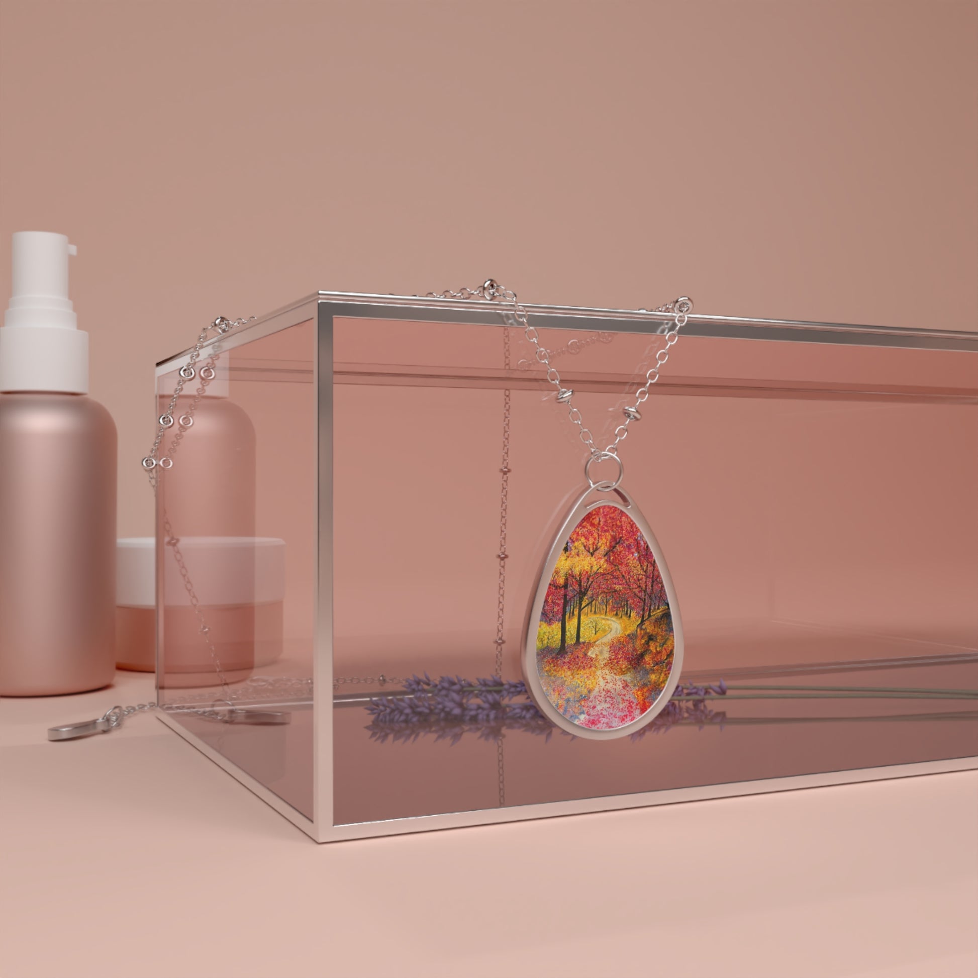 Silver Oval Pendant Necklace with Hand-painted Fall Forest Road Nature Art