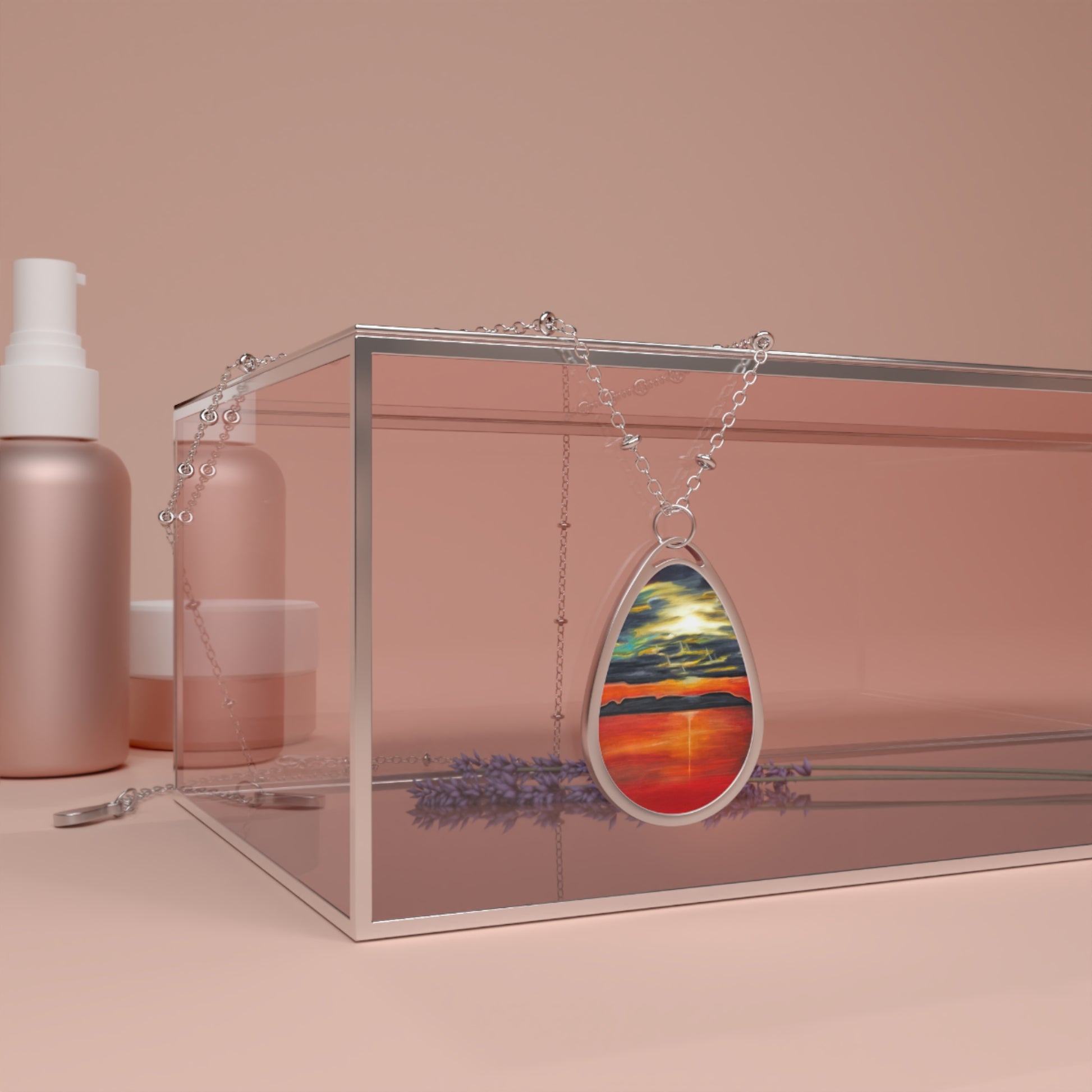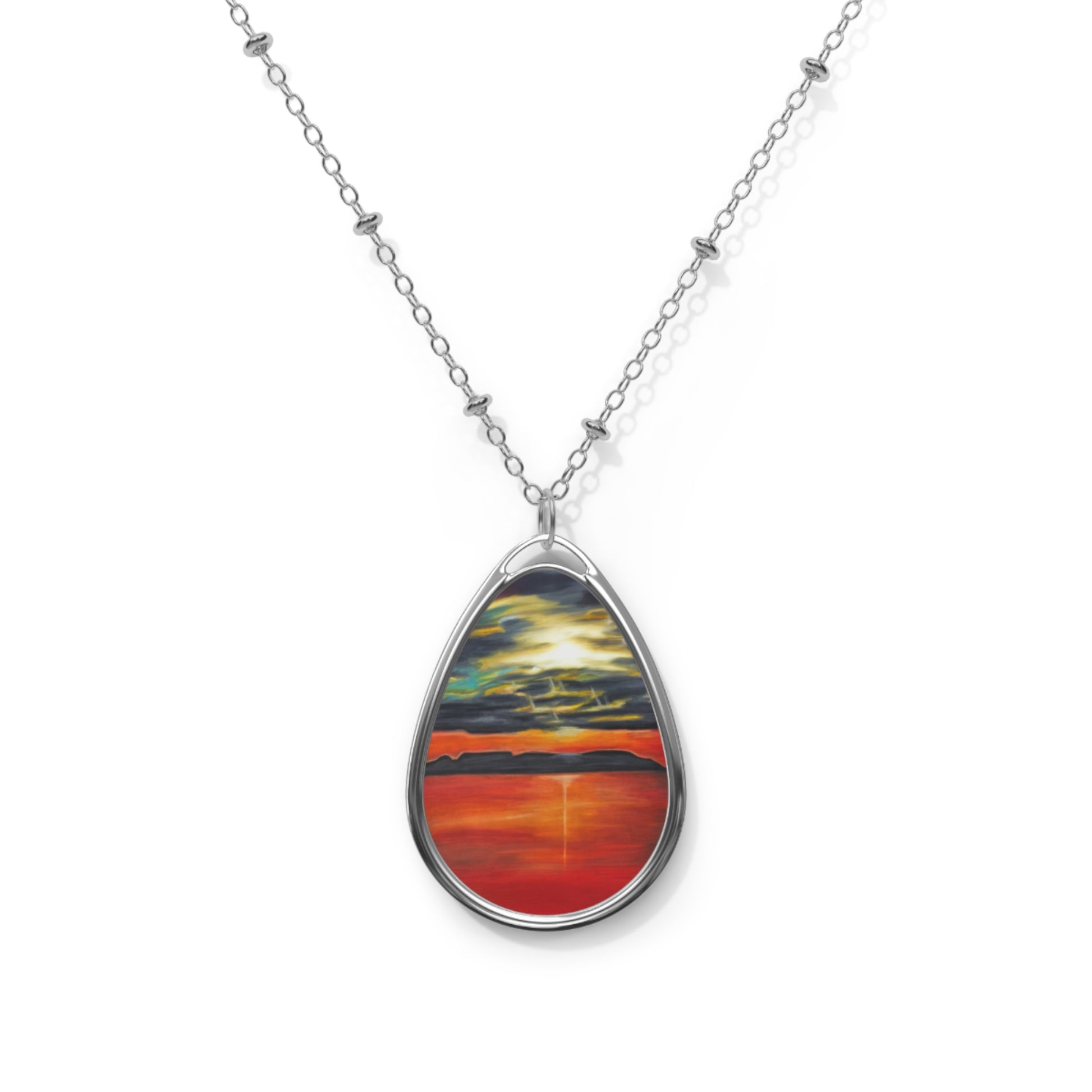 Silver Oval Pendant Necklace with Hand-painted Sleeping Giant Sunset Art