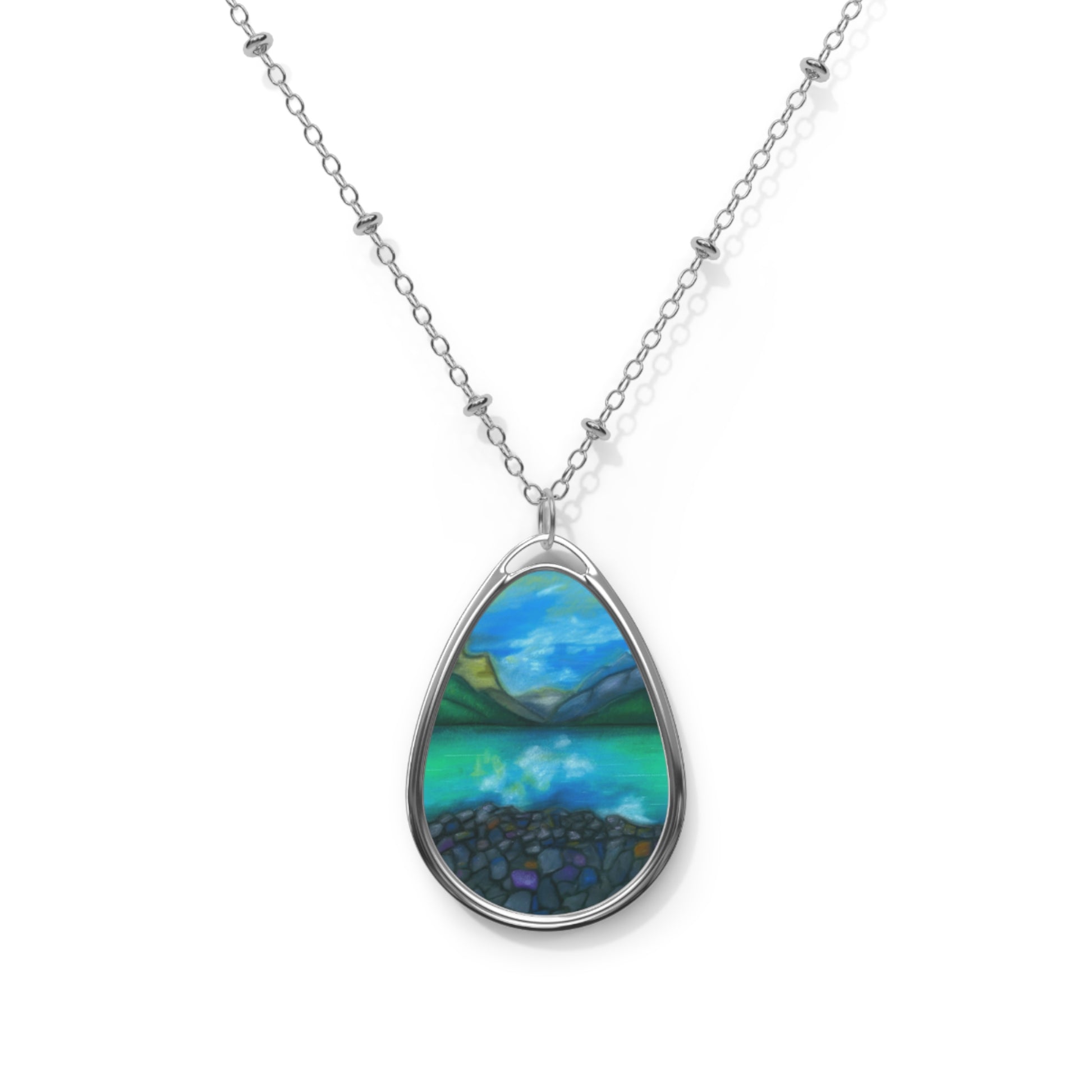Silver Oval Pendant Necklace with Hand-painted Teal Mountain Lake Nature Art